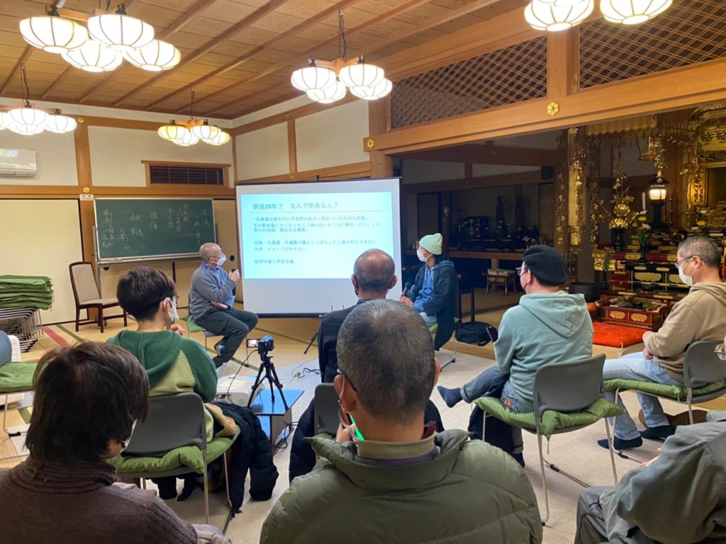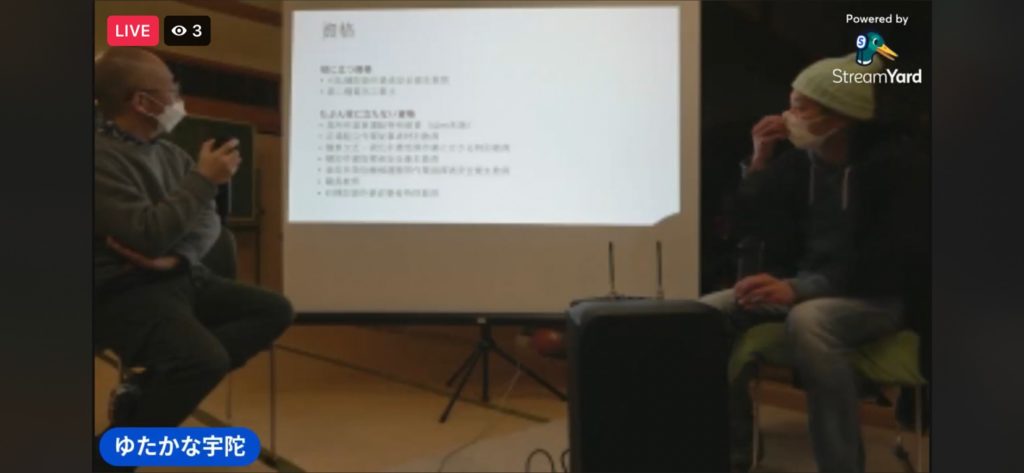 「ちょっと人前で話すのは苦手」とおっしゃっていたので、こちらでパワーポイントを作ってそれに沿ってお話を聞きました。初めての試みでFacebookでのライブ配信も行ってみました。ゆたかな宇陀のFacebookページでライブ配信を行いましたが、ちょっと映像が暗かったです。参加は、非会員の方は、宇陀市より4名 吉野町より1名。会員5名参加。皆様ありがとうございました。
