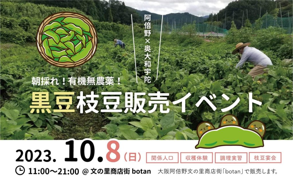 活動報告 【体験プログラム】宇陀黒豆プロジェクト(大宇陀地区)黒豆枝豆販売イベント(大阪阿部野区)@令和5年10月8日 2023.10.08 2026.02.06 活動報告 昨年から連携を取らせてもらっている大阪のシェアキッチンのbotanさんで黒豆の枝豆の販売イベントを行いました。開催日の朝、100株収穫し、そのまま大阪へ持ち込んで、会場の方で枝から豆を採取するという体験をしてもらいました。今回はゆたかな宇陀の畑の枝豆は生育が悪く、開催に間に合わなかったので宇陀市内の別の農家さんに協力してもらいました。100株は無事完売しました。 Post 記事のタイトルとURLをコピーする 【体験プログラム】 宝石探しとアクセサリー作り体験(室生地区@令和5年9月2日&9月11日開催 前の記事 【体験プログラム】ライトアップ設置のお手伝い(菟田野地区)@令和5年10月28日開催 次の記事 関連記事 【体験プログラム】宇陀黒豆プロジェクト(大宇陀地区)説明会@令和5年6月24日 2023.06.24 【体験プログラム】ごぼう収穫体験(菟田野地区)@令和4年11月13日開催 2022.11.14 ♪【関係人口勉強会&交流会】第11回目ゲスト:大西ちかこさん@令和5年3月19日 2023.03.20 ★【体験プログラム】宝石探しと陶芸体験(室生地区)@令和4年8月20,21日開催 2022.08.23 【体験プログラム】宇陀黒豆プロジェクト(大宇陀地区)黒豆味噌づくり@令和6年3月11日 2024.03.19 【体験プログラム】宇陀黒豆プロジェクト(大宇陀地区)乾燥作業@令和6年1月24日 2024.01.24 【体験プログラム】 じゃがいも収穫体験(菟田野地区)@令和5年6月24日開催 2023.06.24 【体験プログラム】 宝石探しとアクセサリー作り体験(室生地区@令和5年9月2日&9月11日開催 2023.09.12 コメント コメント ( 0 ) トラックバック ( 0 ) この記事へのコメントはありません。 この記事へのトラックバックはありません。 トラックバックURL 返信をキャンセルする。 名前(例:山田 太郎) ( 必須 ) E-MAIL ( 必須 ) - 公開されません - URL コメントを書く
