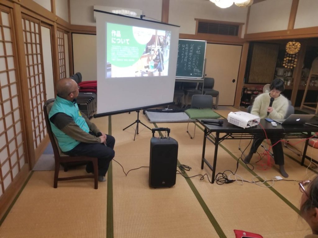 阿児さんには作品についていろいろ話をしてもらいました。それと、その話の中で、滞在して制作や在廊する中での話として、「滞在している地域での偏見の目」についても話してもらいました。田舎の人が決めつけている性別や年齢で「こうあるべき」という思い込みがアーティストの滞在のストレスとなる危険もあるという話です。それに関しては、本当に我々が気をつけないといけないことだなと思いました。