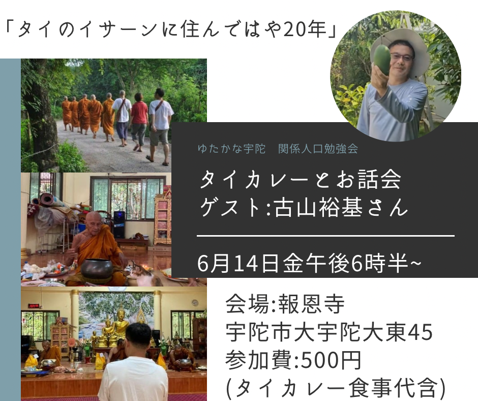 今回の関係人口勉強会&交流会は、タイのイサーン(東北部)に20年お住まいの古山裕基さんをゲストにお招きしました。古山さんのプロフィールはこちら https://isanikikata.com/selfintro