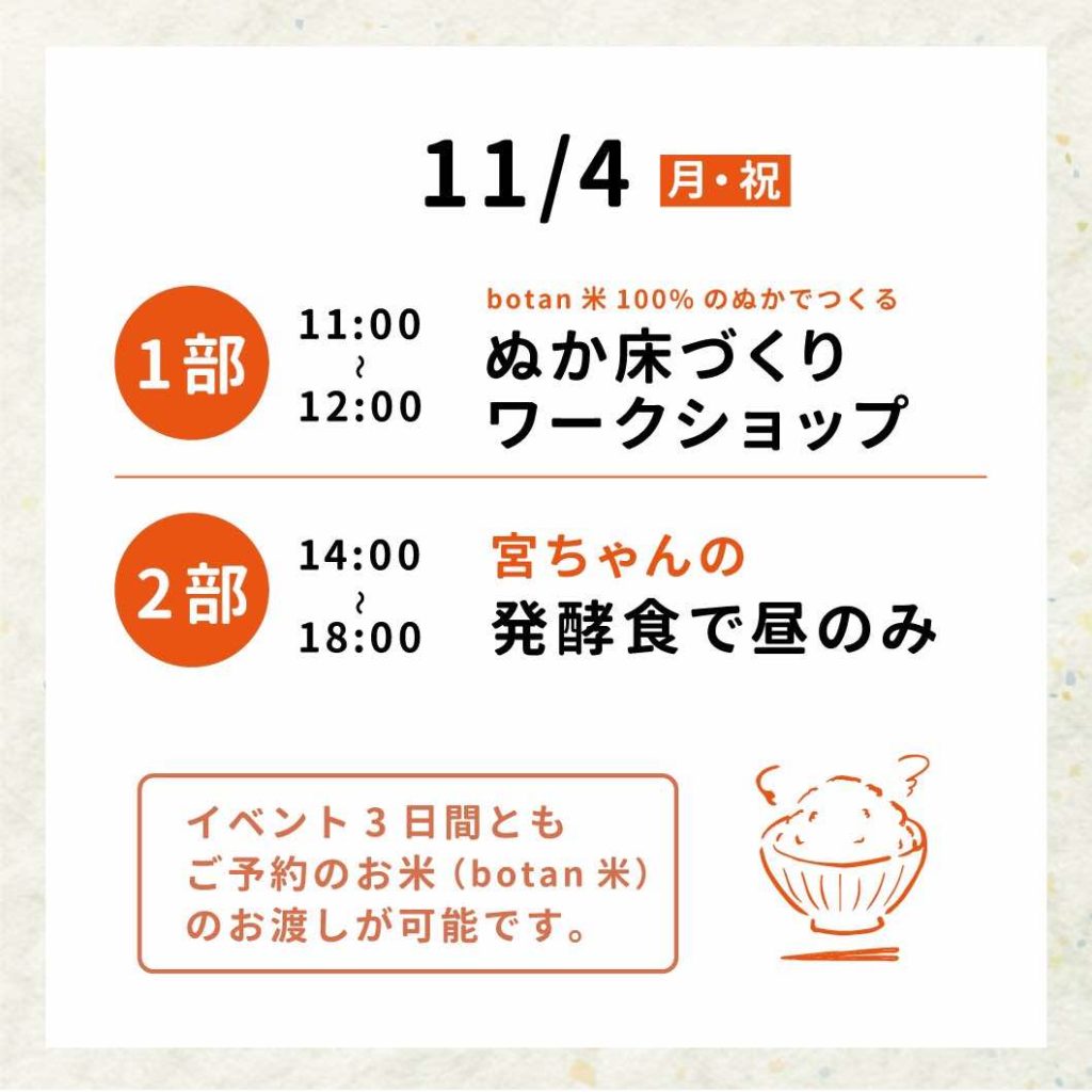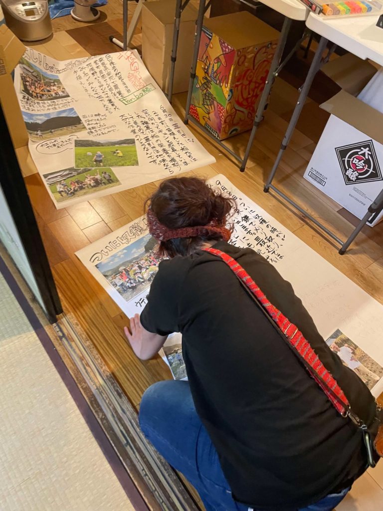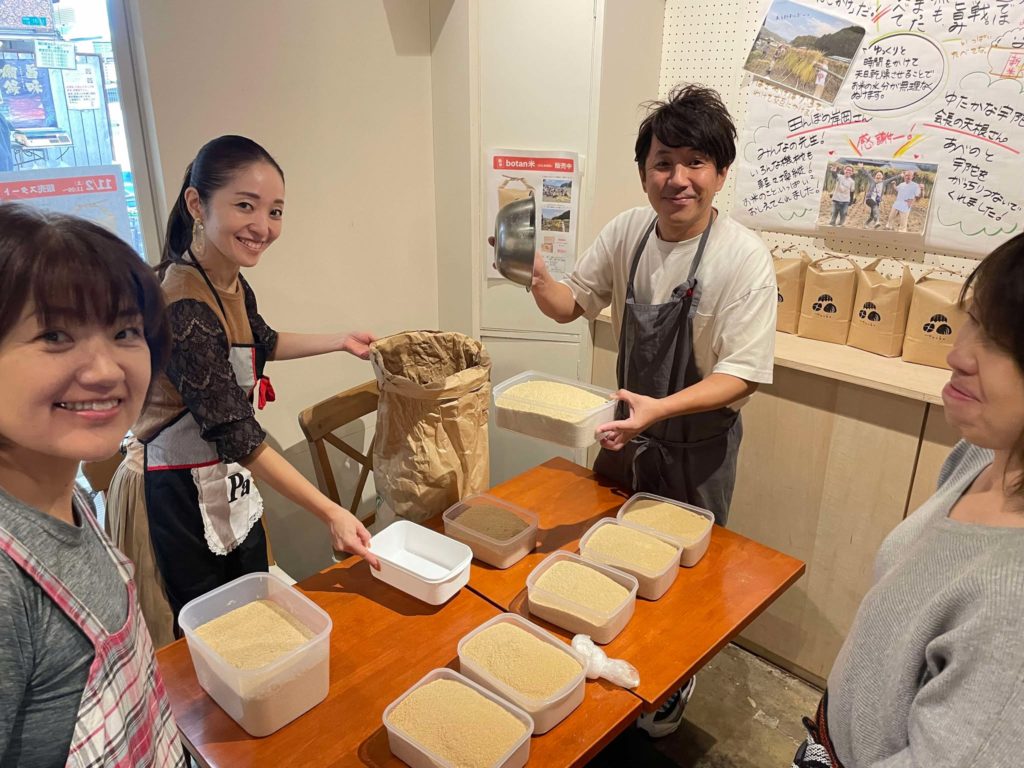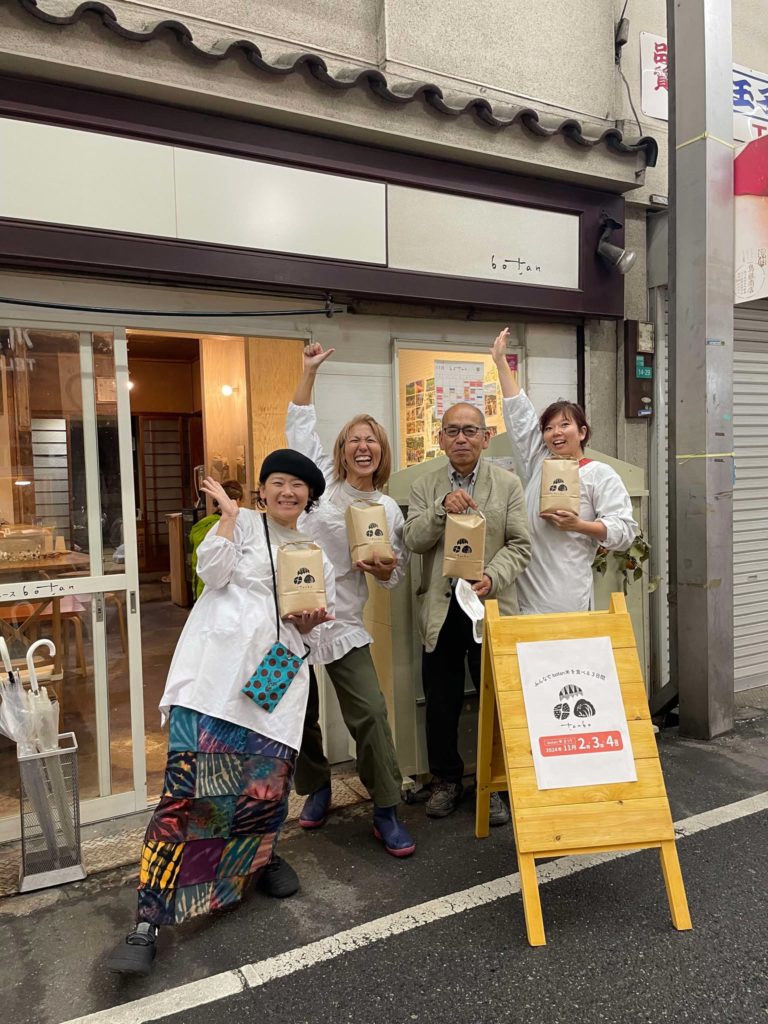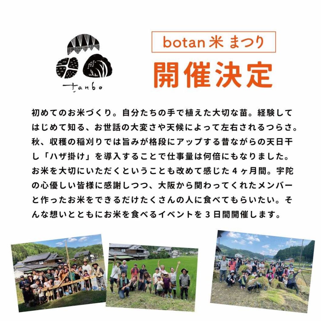 活動報告 【botan米を宇陀で作る】botan米祭り 令和6年11月2~4日開催 2024.11.02 2026.02.06 活動報告 「botan米 祭(ぼたんまいまつり)」と題し、お米を食べて宇陀の魅力を知るイベントを共催しました。宇陀からは、圃場の管理者である岸岡淳二さんと天根会長が大阪へ行き、botanのゲストの皆さんと交流しながら、宇陀のアピールをしてきました。botanさんはオリジナルデザインの米袋や一合升を作成されました。 来場者は3日間でのべ150名で、宇陀のアピールもたくさん出来ました。 Post 記事のタイトルとURLをコピーする 【botan】黒枝豆販売会 令和6年10月21日開催 前の記事 2024/11/30(土)13:30~【榛原・ゆたかな宇陀】『里山は持続可能な世界だった』無料上映会&お話会 次の記事 関連記事 【体験プログラム】宇陀黒豆プロジェクト(大阪阿倍野)黒豆みそづくり @令和6年3月24日(日) 2024.03.25 【体験プログラム】ごぼう収穫体験(菟田野地区)@令和5年11月11日開催 2023.11.12 ★【体験プログラム開催②】宝石探しと陶芸体験(室生地区)@令和3年11月21日 2021.11.22 ♪【関係人口勉強会&交流会】第10回目:宇陀を楽しむ会@令和5年2月23日 2023.02.24 【体験プログラム】 じゃがいも収穫体験(菟田野地区)@令和5年6月24日開催 2023.06.24 【関係人口勉強会&交流会】第14回目 交流会@令和5年12月27日 2023.12.28 【体験プログラム】宇陀黒豆プロジェクト(大宇陀地区)収穫&はざかけ作業 @令和5年12月10日 2023.12.10 【体験プログラム】宇陀黒豆プロジェクト(大宇陀地区)薪割りと黒豆選別 @令和6年2月25日 2024.02.25 コメント コメント ( 0 ) トラックバック ( 0 ) この記事へのコメントはありません。 この記事へのトラックバックはありません。 トラックバックURL 返信をキャンセルする。 名前(例:山田 太郎) ( 必須 ) E-MAIL ( 必須 ) - 公開されません - URL コメントを書く