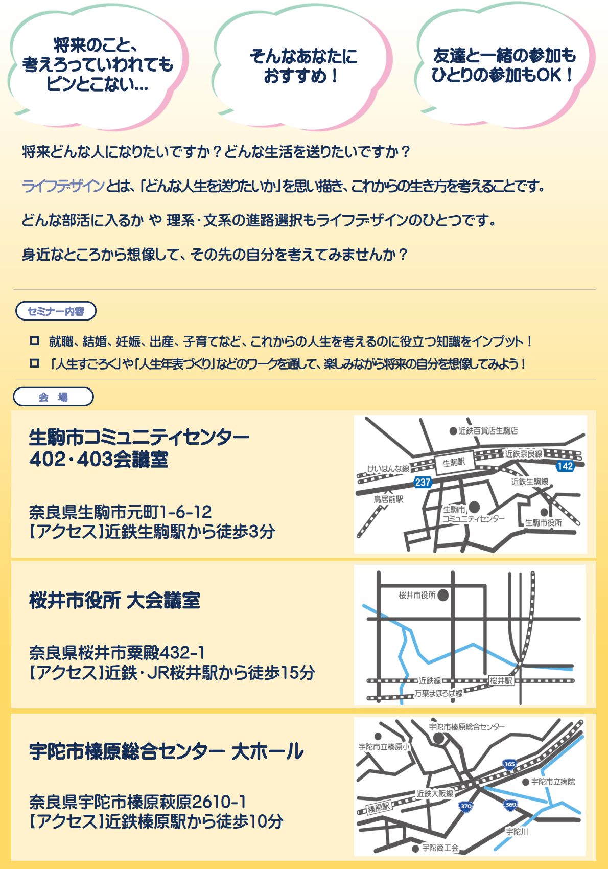 2026 2/15 2026/02/15(日)13:00~15:30【大宇陀・宇陀市榛原総合センター】ライフデザインセミナー \ 中学生・高校生のみなさんへ / 自分の“未来の姿”を想像してみませんか? 奈良県主催の 「ライフデザインセミナー」 が、 2月15日(日)に宇陀市榛原総合センターで開催 されます! 「どんな生活を送りたい?」「どんな大人になりたい?」 そんな問いを、楽しみながら考えられる人気のセミナーです。 人生すごろく、人生年表づくり、将来に役立つ知識のインプット など ゲーム感覚で未来の自分を考えられる、前向きな時間になるはずです✨ 市内の中高生のみなさん、ぜひご参加ください! 時間 13:00~15:30 日時 2/15(日)13:00~15:30 場所 宇陀市榛原総合センター(宇陀市榛原萩原2610−1) 対象 奈良県内に在学・在住の中学生・高校生世代 参加費 無料 定員 30名 申込み期限 2/8(日) 詳細・申込 奈良県地域創造部こども・女性局、こども・女性課 こども・若者支援係 Post イベント一覧